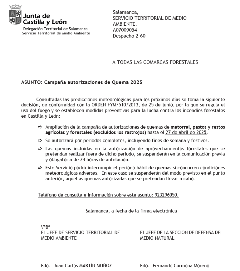 AvisosEl AyuntamientoBandosNoticias Ampliación campaña de quemas Hace 6 meses Ampliación de la campaña de autorización de quemas hasta el 27 de Abril de 2025.Consultadas las predicciones meteorológicas para los próximos días se toma la siguientedecisión, de conformidad con la ORDEN FYM/510/2013, de 25 de junio, por la que se regula eluso del fuego y se establecen medidas preventivas para la lucha contra los incendios forestalesen Castilla y León:Ampliación de la campaña de autorizaciones de quemas de matorral, pastos y restosagrícolas y forestales (excluidos los rastrojos) hasta el 27 de abril de 2025.Se autorizará por periodos completos, incluyendo fines de semana y festivos.Las quemas incluidas en la autorización de aprovechamientos forestales que sepretendan realizar fuera de dicho periodo, se suspenderán en la comunicación previay obligatoria de 24 horas de antelación.Este Servicio podrá interrumpir el periodo hábil de quemas si concurren condicionesmeteorológicas adversas. En este caso se suspenderán del modo previsto en el puntoanterior, aquellas quemas autorizadas que se pretendan llevar a cabo. Teléfono de consulta e información sobre este asunto: 923296050.